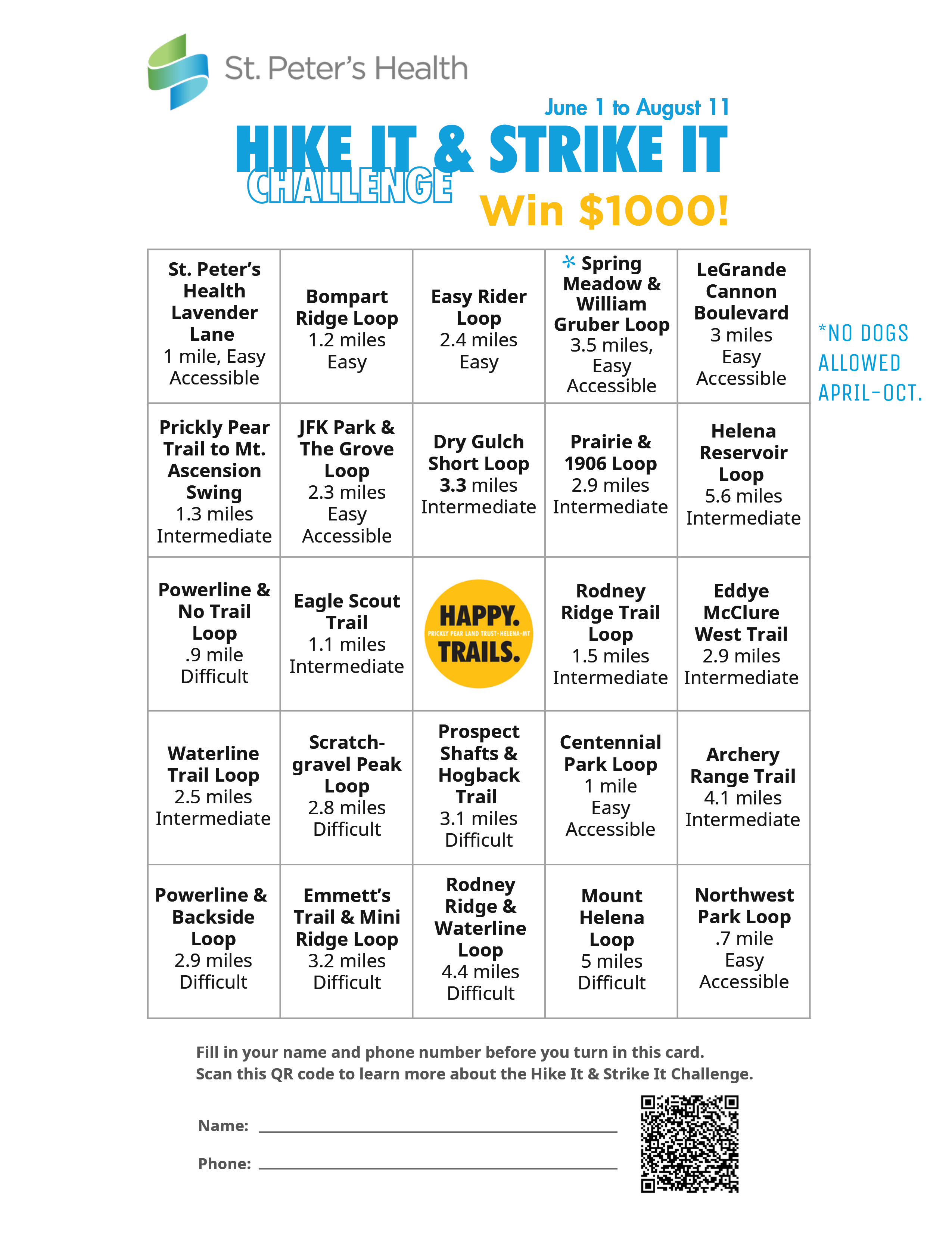- Walk, run, bike or hike the trails on the bingo card. Take a time-stamped photo of the trail sign or map it on your smart watch or app for verification. Selfies are encouraged! (Tag us on social media with #HikeItandStrikeIt)